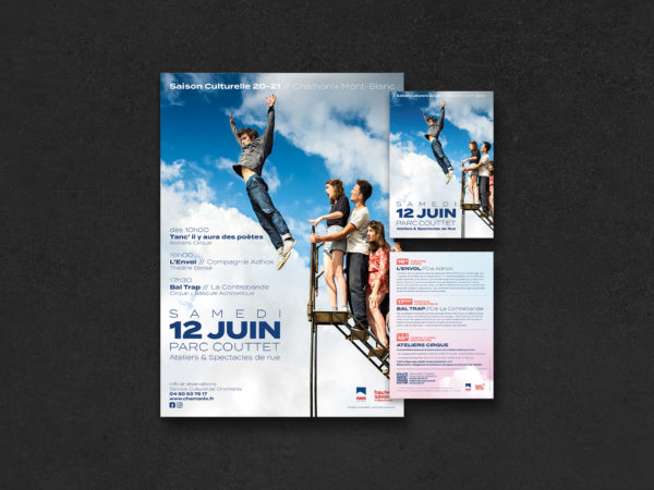 La commune de Chamonix souhaitait mettre en place un événement pour la fin de sa saison culturelle 2021. Nous avons proposé, en contraste avec l’année culturelle morose et chaotique, de clôturer sur une action enjouée et festive dont l’esprit sera reflété dans l’affiche affiche et le flyer. Nous avons opté pour l’usage d’une photo d’une…